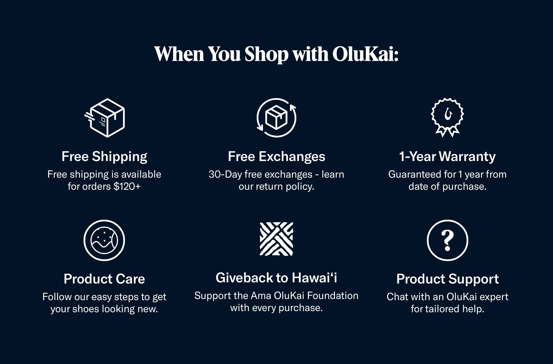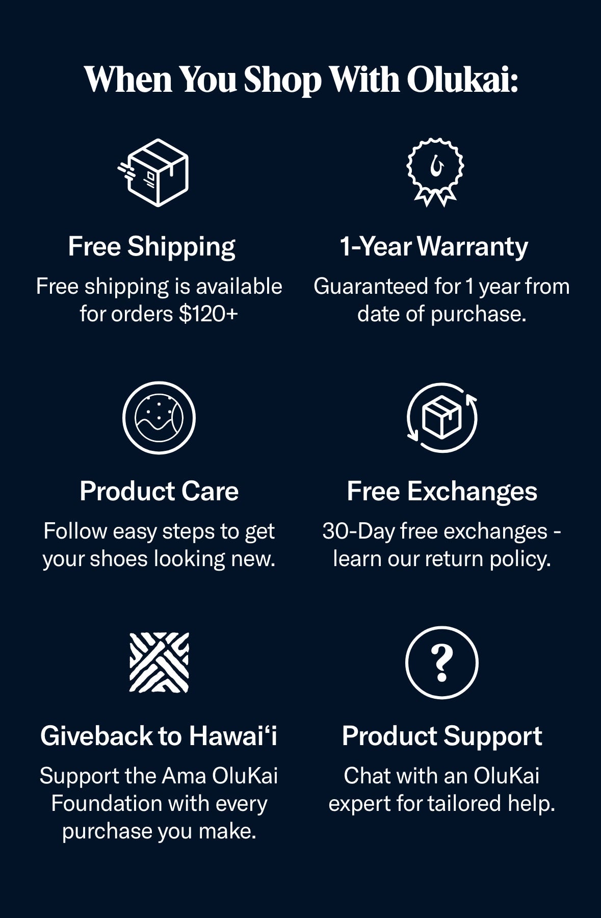 OluKai-Schuhe haben eine Herstellergarantie von einem Jahr ab dem Kaufdatum.