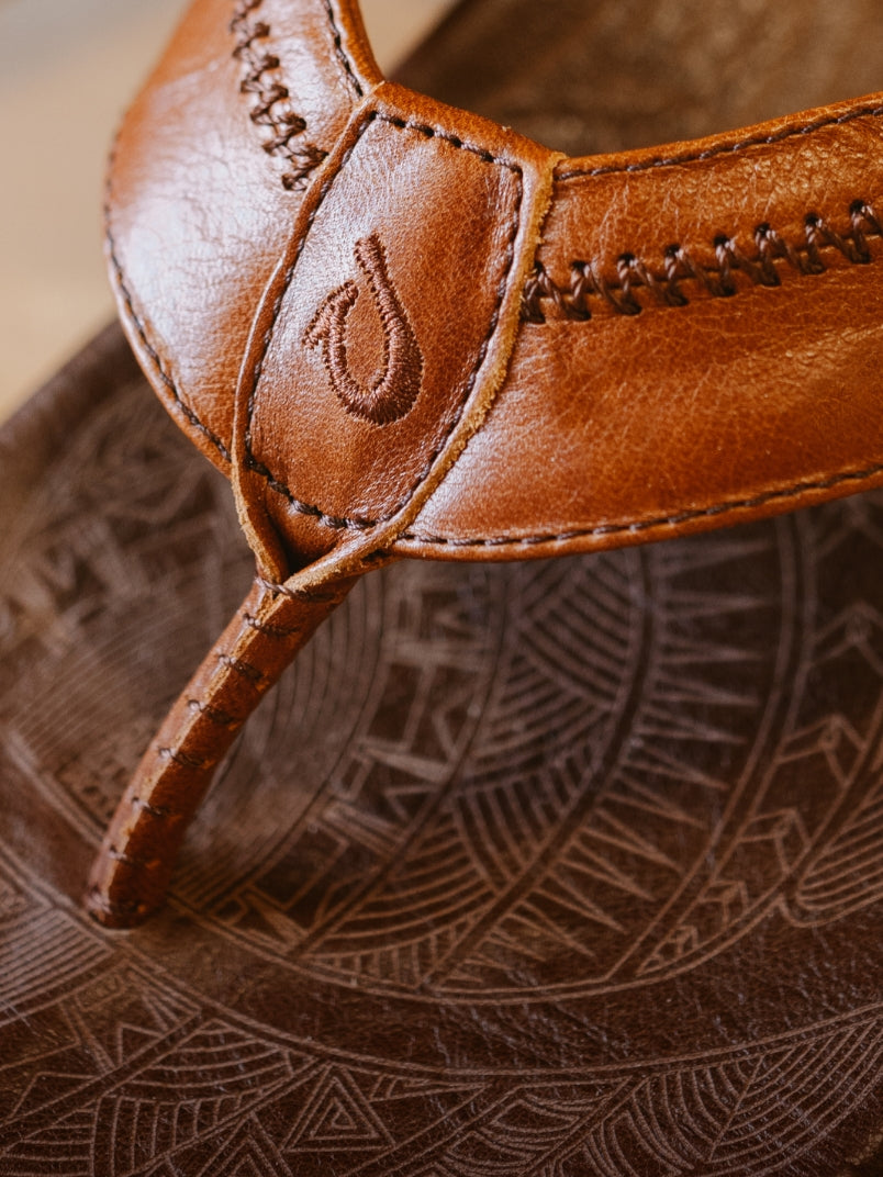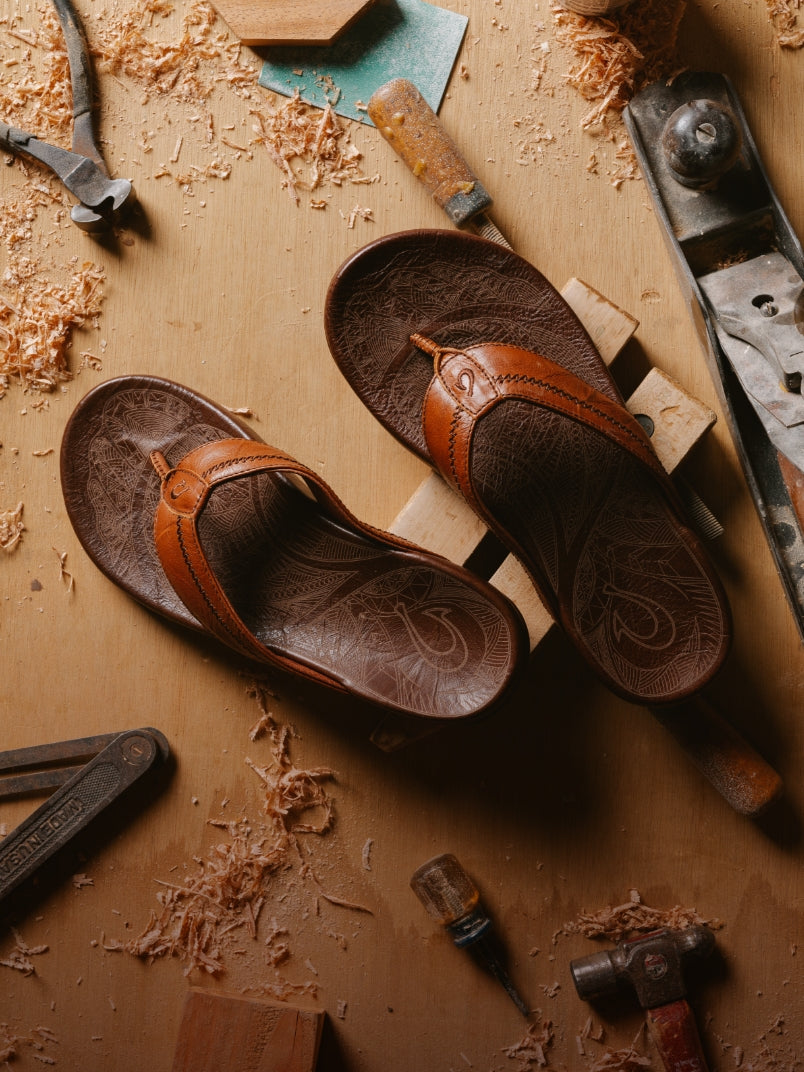 Was zeichnet eine OluKai-Sandale aus? Wir glauben, es ist die Mischung aus Tradition, Handwerkskunst und akribischer Liebe zum Detail. Die Hiapo, eine unserer ursprünglichen Sandalen, wird fachmännisch aus natürlich getrommeltem oder marmoriertem Vollnarbenleder hergestellt. Sie ist mit traditionellen Peitschenstichen handgenäht und mit polynesischen Tätowierungen auf dem Fußbett verziert. Mit jedem Tragen wird der Hiapo noch edler. Er eignet sich perfekt für Strandausflüge, sollte aber nicht über längere Zeit mit Wasser in Berührung kommen, um seine Qualität zu erhalten.