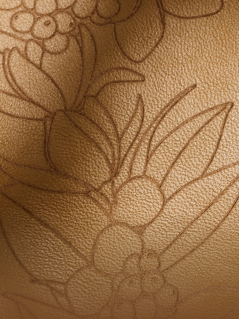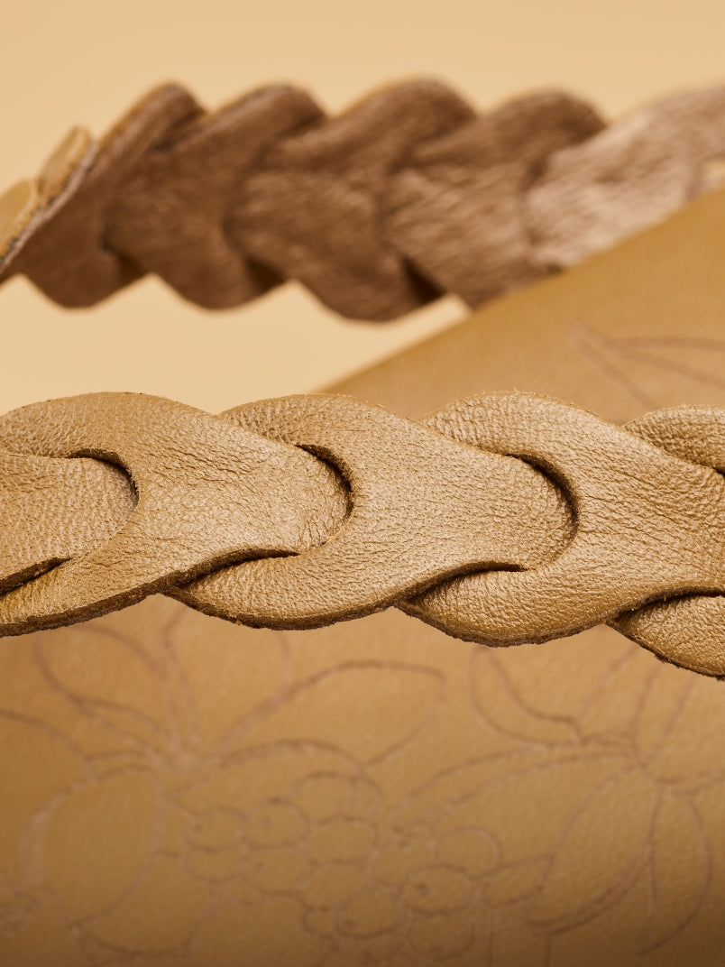 Ineinander verschlungene Lederbänder, die von der Schönheit einer Lei inspiriert sind, kombiniert mit lasergravierten Blumendetails, sorgen für einen mühelos lässigen und doch raffinierten Stil.